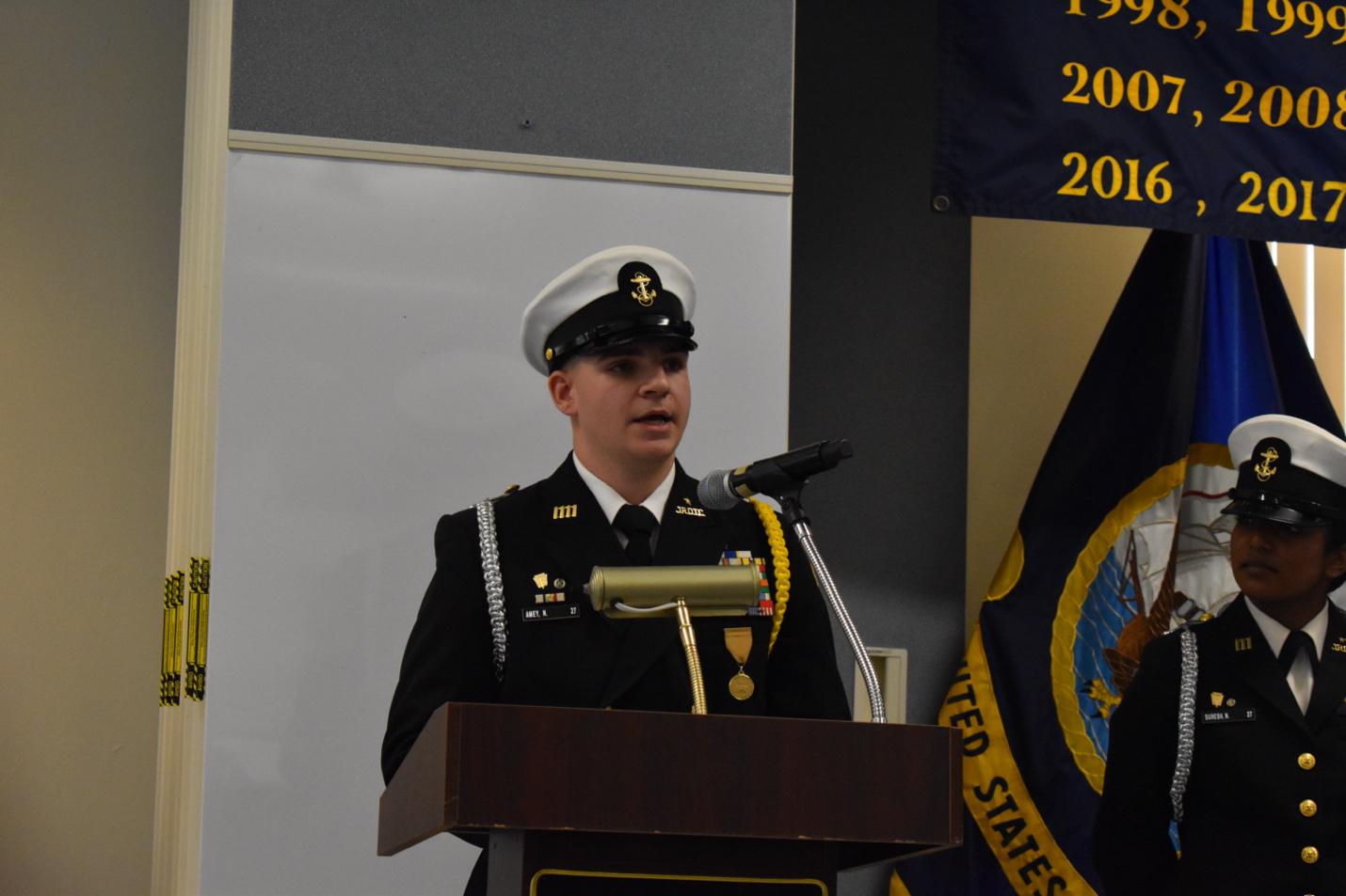 As Battalion Commander, Cadet Amey will be responsible for the well-being of the entire unit, a demanding yet necessary position. Regardless of the numerous responsibilities, the change of command symbolizes the commitment Cadet Amey has made to his fellow NJROTC cadets.