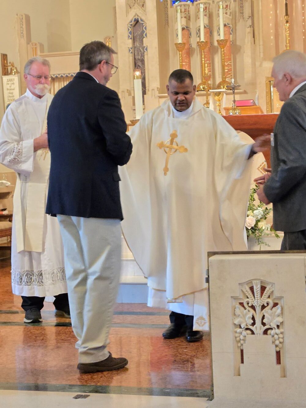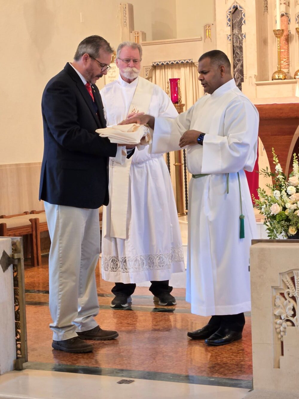 At the 9:30 a.m. mass, the Knights processed with Father and Deacon RJ Johnson to the sanctuary, where Deputy Grand Knight McKenna and Flynn presented the vestments. Father blessed the vestments, then wore them for the mass.