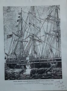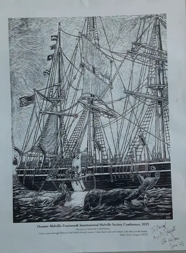 The professor blends his love for Melville and art and was at the Melville Society meeting at Mystic creating screen prints of the Charles W. Morgan; he generously signed a copy and gave it to me as a memento of my visit to Mystic Seaport .