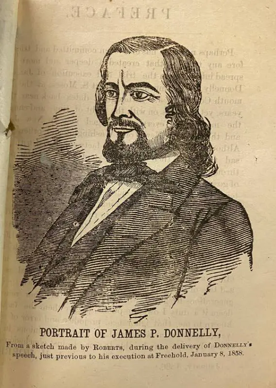 Newell, in his first year as Governor, became involved when Donnelly’s appeals ran out and he sought commutation to a life sentence. While the Court of Pardons, on which the Governor sat ex officio, voted 6 to 2 against a commutation, Newell claimed to have cast the deciding vote for execution. Donnelly was hung in front of the Monmouth County outhouse before a huge crowd, after giving a two-hour talk proclaiming his innocence. He was executed Jan 8, 1858.