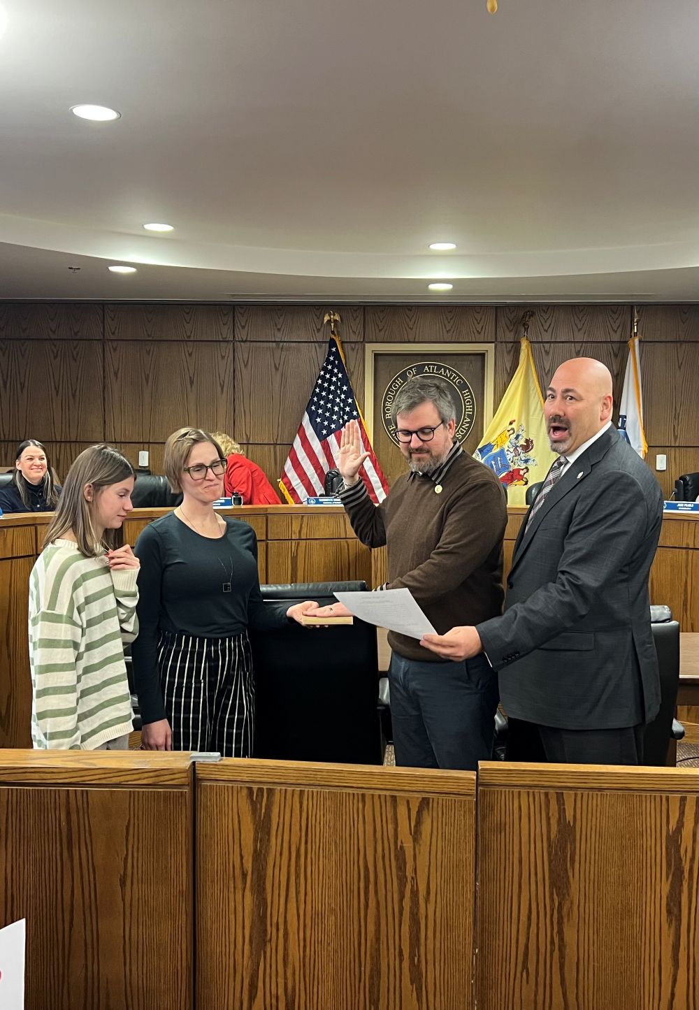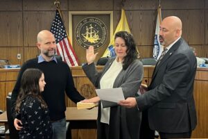 With his wife holding the Bible and his daughter at his side, Atlantic Highlands Councilman Brian Gorsenger was sworn into his first term as borough councilman at the reorganization meeting at Borough Hall at noon on New Year’s Day. Monmouth County Prosecutor Raymond Santiago administered the oath of office.
