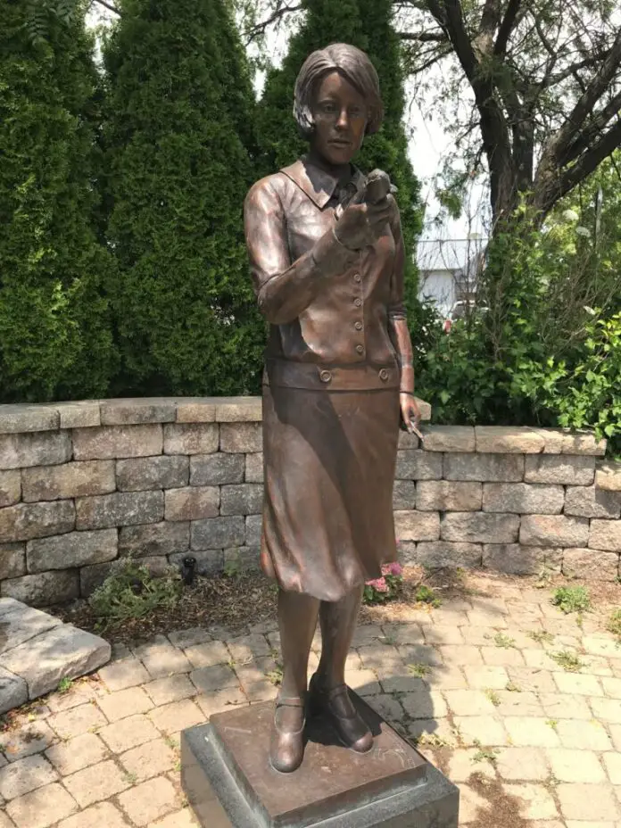 A simple, life size monument in brown, with the single Radium Girl holding a paint brush in one hand and a dying tulip in the other, depicts the tragedy of the factories.