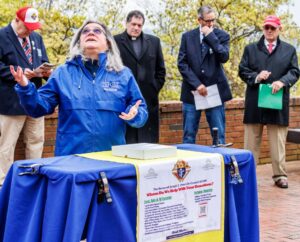 Kevin McKenna, Grand Knight of the Father Donnelly council and Robert Karaczun, field agent for the Knights, also spoke of history during the ceremony honoring the original 1893 Pledge. VFW Post Commandeer Mike Warren led the demonstration of the original pledge and salute at the Liberty Pole facing the Atlantic Ocean, with Louise Welch, Southeast Chapter president of the Columbiettes giving a recitation of the original pledge.