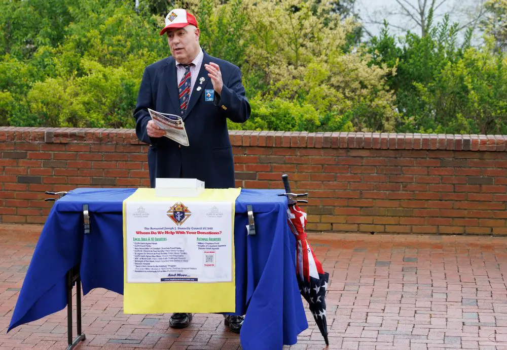 The group processed from the north side of the building to the flagpole on the other side to continue the ceremony where District Marshall of the Knights’ second district John Flynn, Jr. read a history of the pledge and its importance. Kevin Fay, faithful pilot of the Assembly recited the current pledge, which includes the words, “Under God.” and was adopted in the 1950s.
