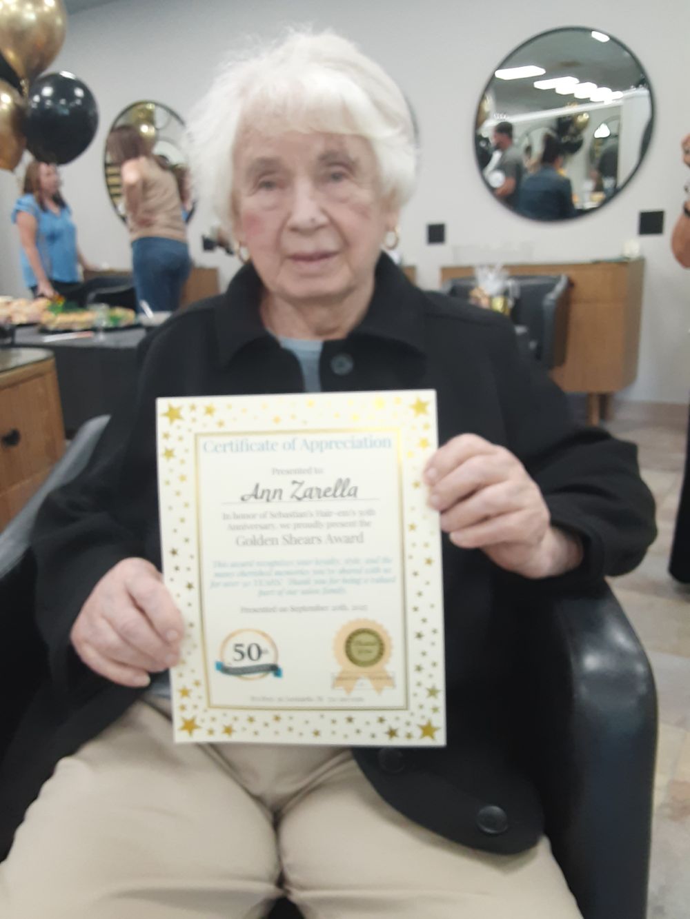 Ann Zarella, who now lives in Bradley Beach, was there for the celebration and the Sebastian’s team presented her with the Golden Shears Award for being the customer who has been with Sebastian’s for more than 50 years. Zarella said she recalls having her hair done at the Muratore kitchen before the shop opened and wanted to be at the event on Saturday. Asked why she made the trip for this celebration, she smiled, shrugged her shoulders and said, “they’re family to me. I had to be here.”