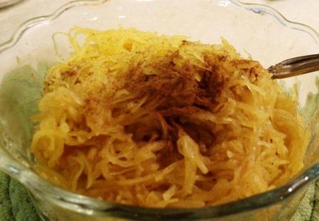 Scoop out stringy squash, mixing to cover it all with the butter and sugar mix. Serve, one half squash per person.