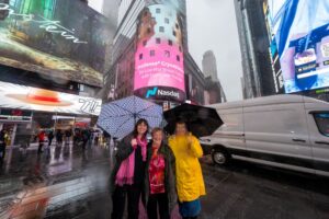 IceCure had also invited my daughter Tracie to accompany me, be in photos, meet some of the very wonderful and very gracious Nasdaq folks who invited us into their office, along with Sara Vehling, IceCure’s Head of Marketing, for tea, coffee and some relaxation in their lounge before going out to the street for the photos. That was only after they presented us each with gift wrapped boxes of chocolate and even umbrellas to celebrate the day’s weather.