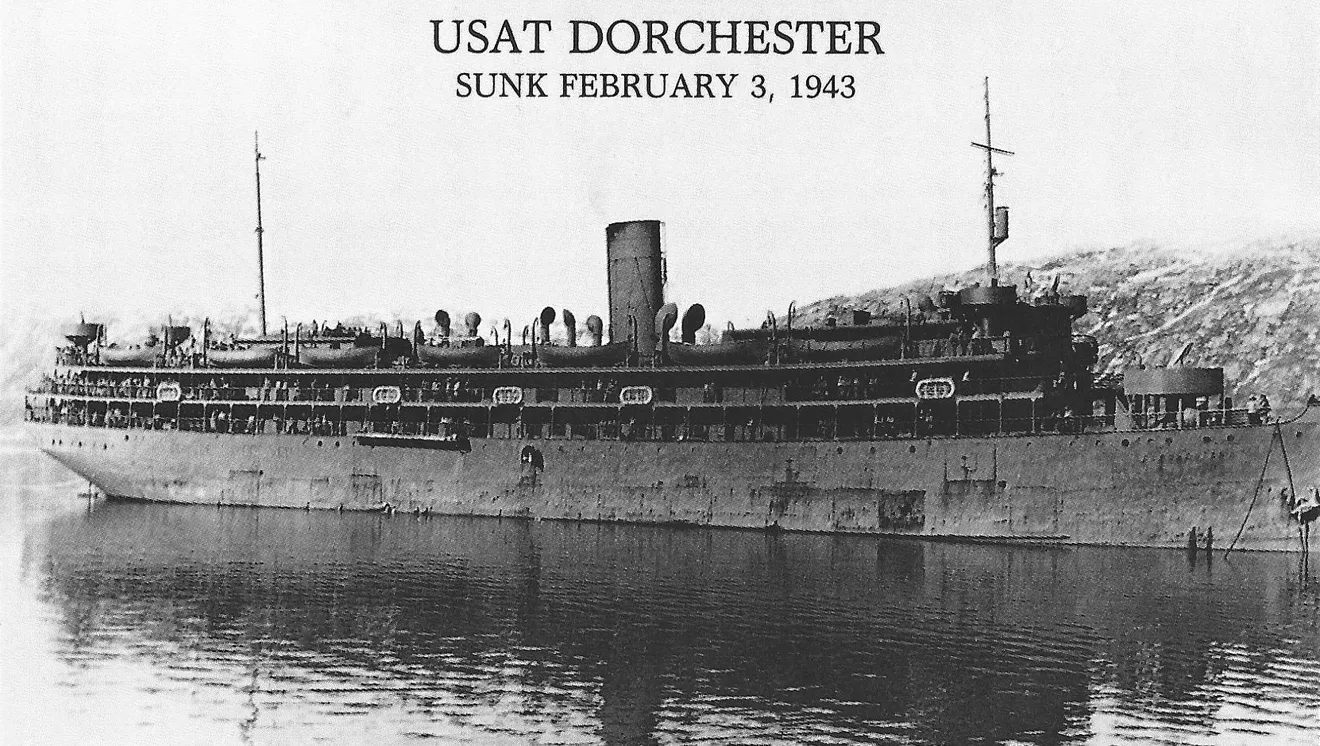 Because of the harsh weather conditions in Greenland, personnel were rotated out on a routine basis. It was when the US Army Transport Ship  Dorchester was carrying servicemen, merchant seamen and civilian worker as replacements in Greenland, that it was struck k by a torpedo from German submarine U-223. The USAT Dorchester begin to sink quickly and during the rush to abandon ship, many men left their life jackets behind.Â