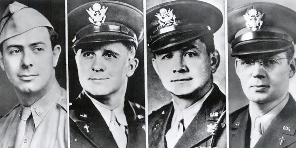 As the ship sank in the icy North Atlantic, the chaplains were distributing life jackets while at the same time offering calm to the frightened men, tending to the wounded and guiding disoriented men towards lifeboats. When the supply of life jackets ran out, the four clergymen took off their own and gave them to four young soldiers.