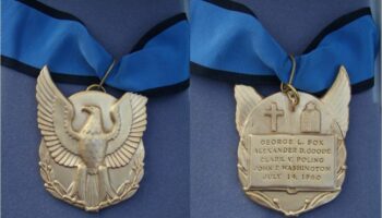 Each of the chaplains was posthumously awarded the Distinguished Service Cross and Purple Heart one year later. Congress later authorized a special, one-time Four Chaplains’ Medal for extraordinary heroism, which was presented to their next of kin in January 1961.