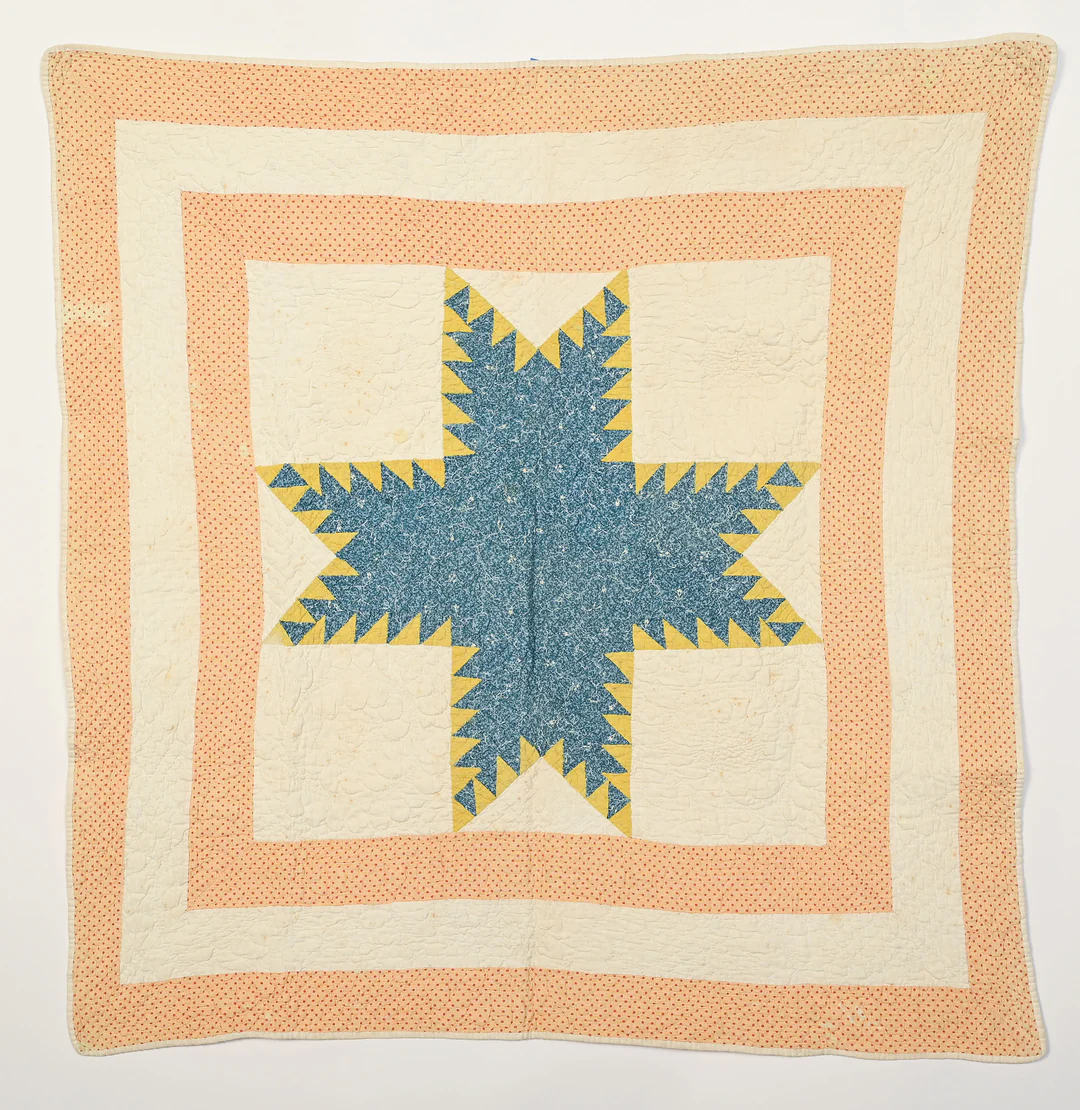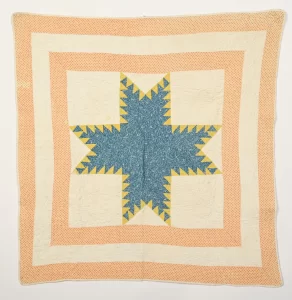 There’s the Hour Glass, a 60 by 38-inch quilt hand pieced and quilted by sisters Esther and Helen Carlson. The ladies were in their 90s when they wanted to make this quilt in 1991 for the birth of Mary Beth Bonanno.
