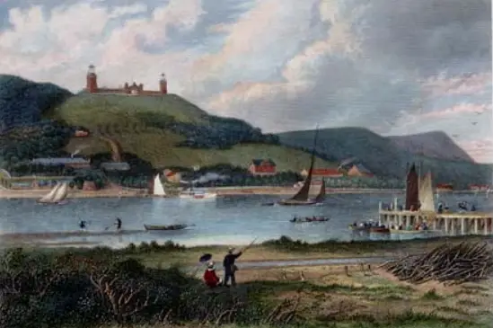 The borough was highlighted in the first of two volumes of Picturesque America when it was published in 1872. It includes a wooden engraving of the Twin Lights with passenger boats unloading visitors at a dock along the Shrewsbury River just below the historic lighthouse.